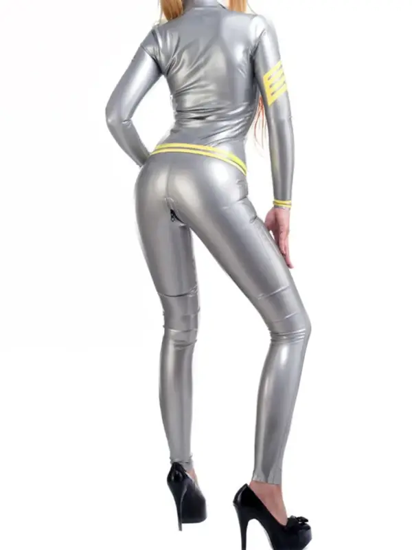 Silver High-Neck Latex Catsuit with Epaulettes and Yellow Trim – Full-Body Zipper Design