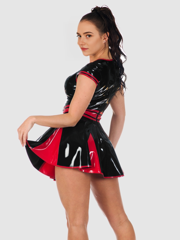 Latex Cheerleader-Inspired Dress with V-Neck and Custom Number Design