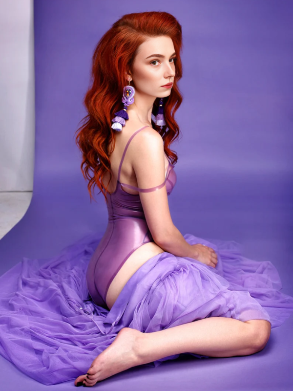 Luxe Lavender Transparent Latex Bodysuit – Spaghetti Straps, High-Cut Leg, Floral Accents