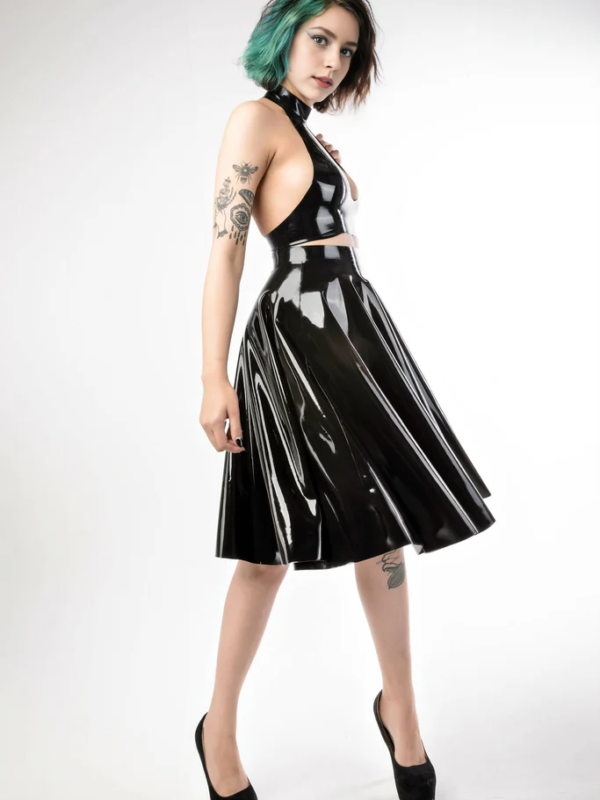 Sleek Latex Skater Dress with Deep Scoop Neckline – 35cm Skirt Length