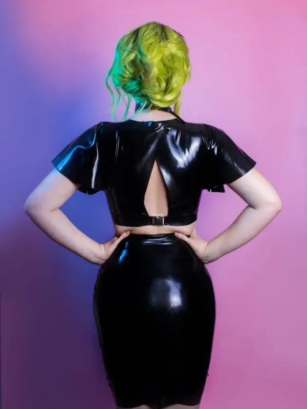 • -53% Latex Plunge Batwing Crop Top with Back Buckle Closure – Glossy Black